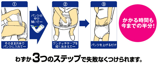 - ● 前後のワンタッチテープがリハビリパンツ™にぴったりついて、装着がかんたん。上げ下げしてもズレません。